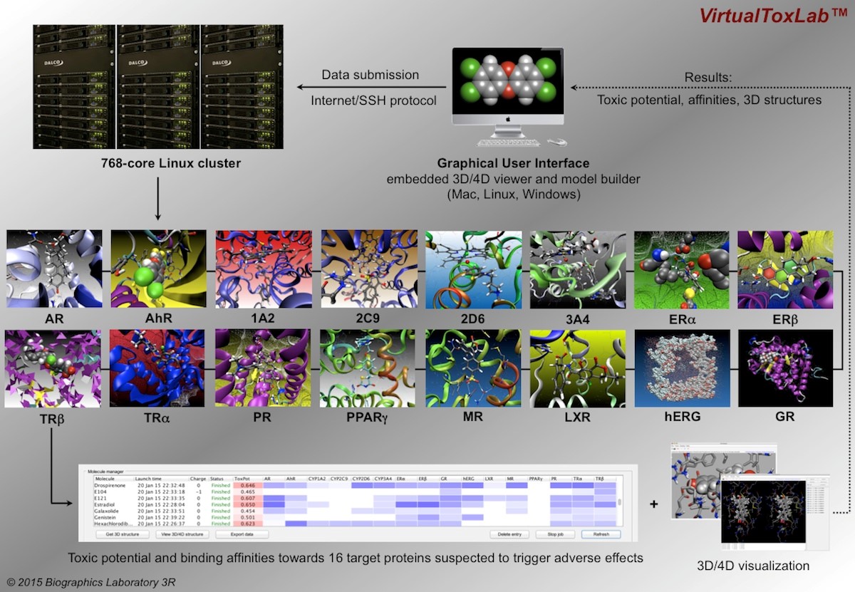 Erzeugung computerbasierter Voraussagen zum toxischen Potential von Chemikalien und Arzneistoffen. Mit der Computersoftware VirtualToxLab können potentiell toxische Stoffe ermittelt werden. Dank dieser Computersimulation können Tierversuche und teilweise sogar klinische Studien reduziert und/oder optimiert werden. Im besten Fall werden Tierversuche sogar überflüssig. Das Tool berechnet Wasserstoffbrückenbindungen und Bindungsaffinitäten von Liganden an 16 Rezeptoren. Diese Rezeptoren sind potentielle Bindungsstellen für endokrine und metabolische Störungen sowie Kanzerogenität und Kardiotoxizität. Die vom Programm vorausgesagte Bindung kann in Echtzeit in 3D oder 4D betrachtet werden. Daraus wird das toxische Potential berechnet, welches zwischen 0 und 1 liegt. Ein Wert unter 0.4 wird als unbedenklich bezeichnet. Liegt der Wert unter 0.6 sollte die Substanz sicherlich nicht über längere Zeit eingenommen werden und bei einem Wert über 0.6 muss mit akuten Gesundheitsfolgen gerechnet werden.